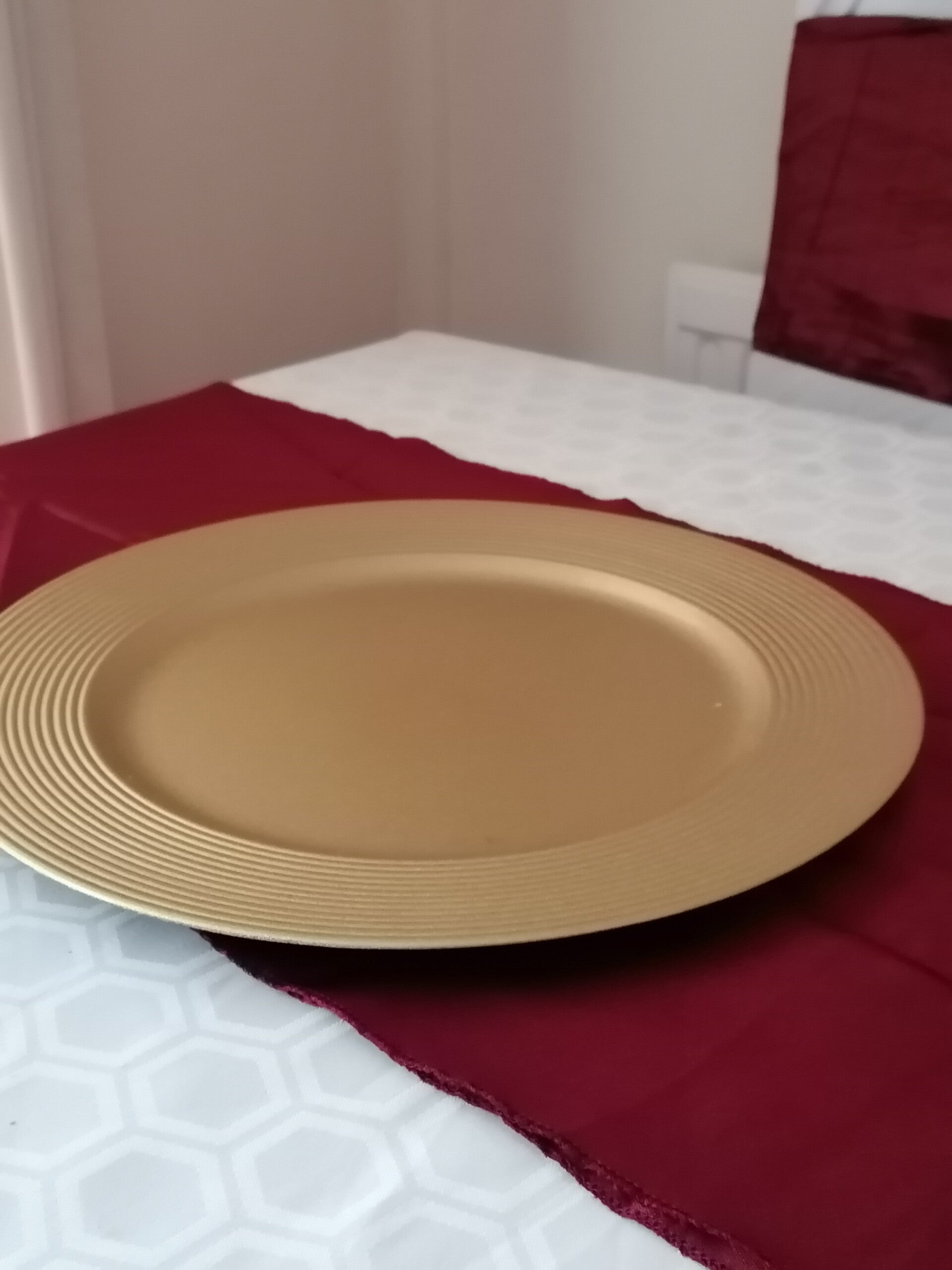 These gold coloured plate chargers will help make any table placement give a look of luxury.
