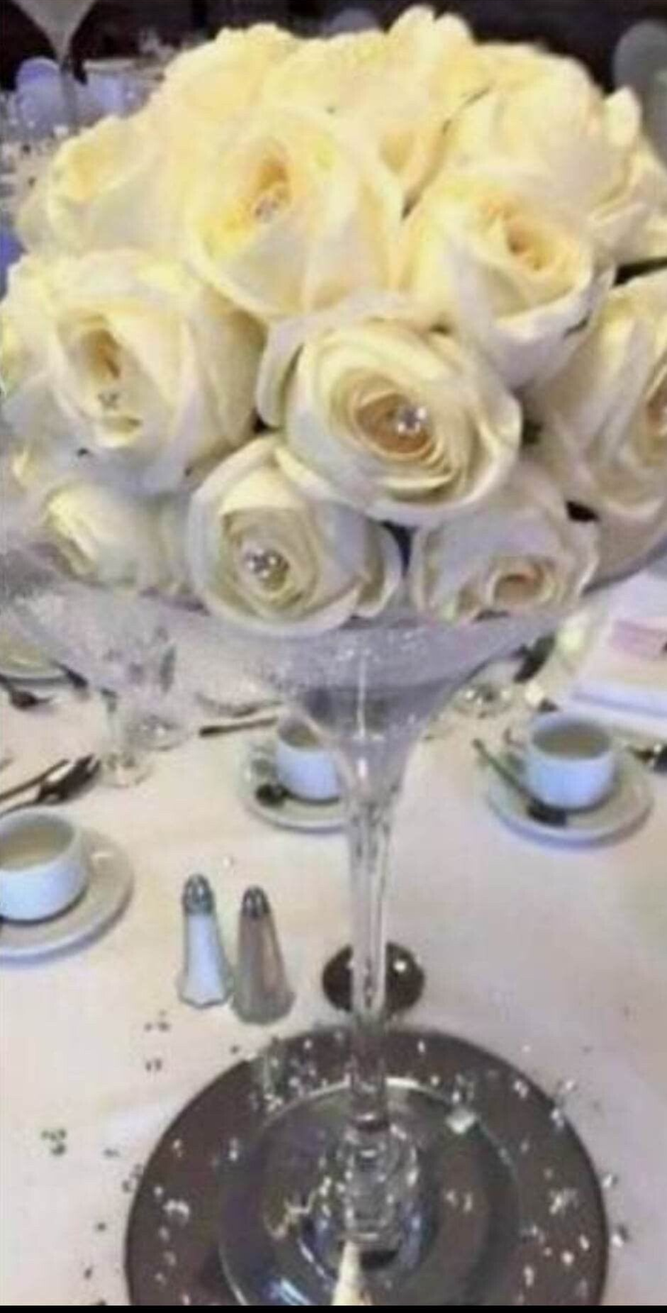 These large centrepieces along with crystals a white rose flower topper can have L.E.D micro lights within the crystals to give an added feel of luxury, placed upon a large mirror plate.