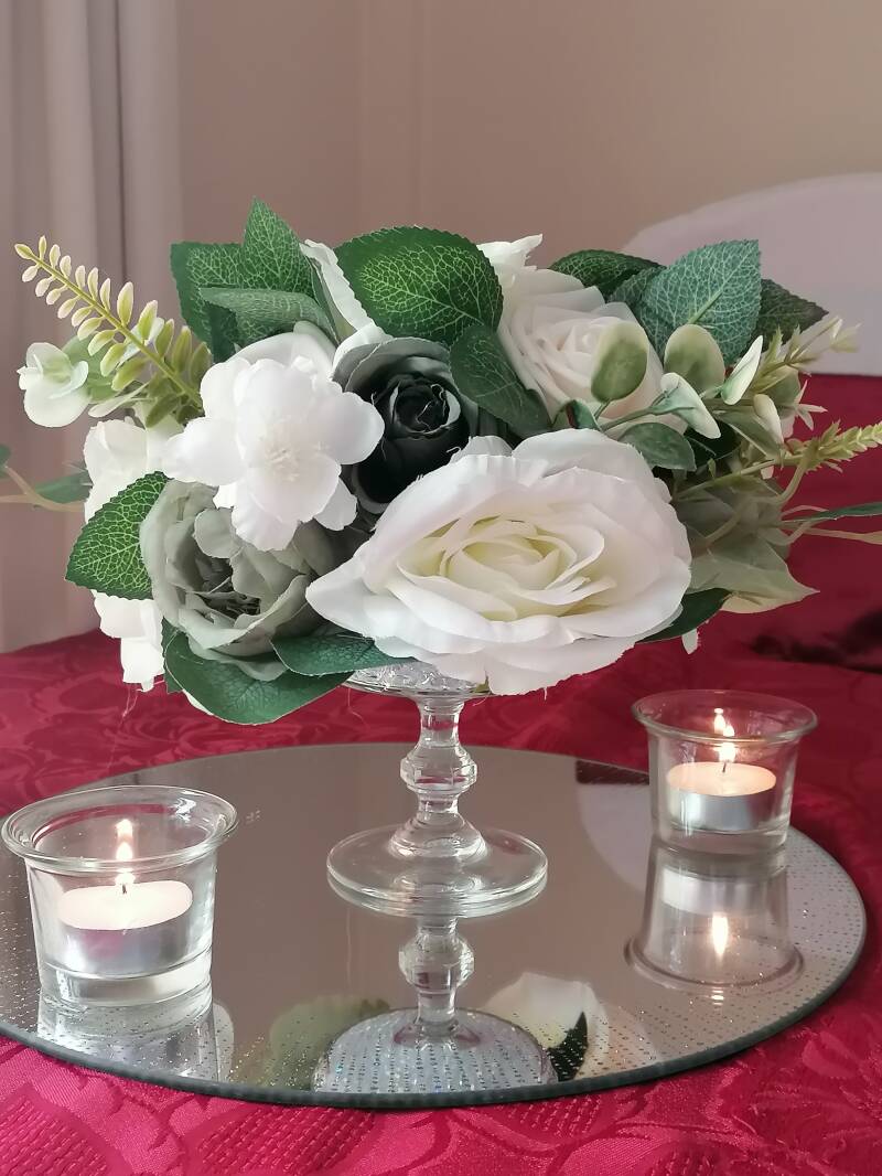 Ideal with small flower arrangement on a bed of crystals, with or without mirror plate. Timeless classic, elegantly gracing any reception table or as a small adornment on ceremony table.