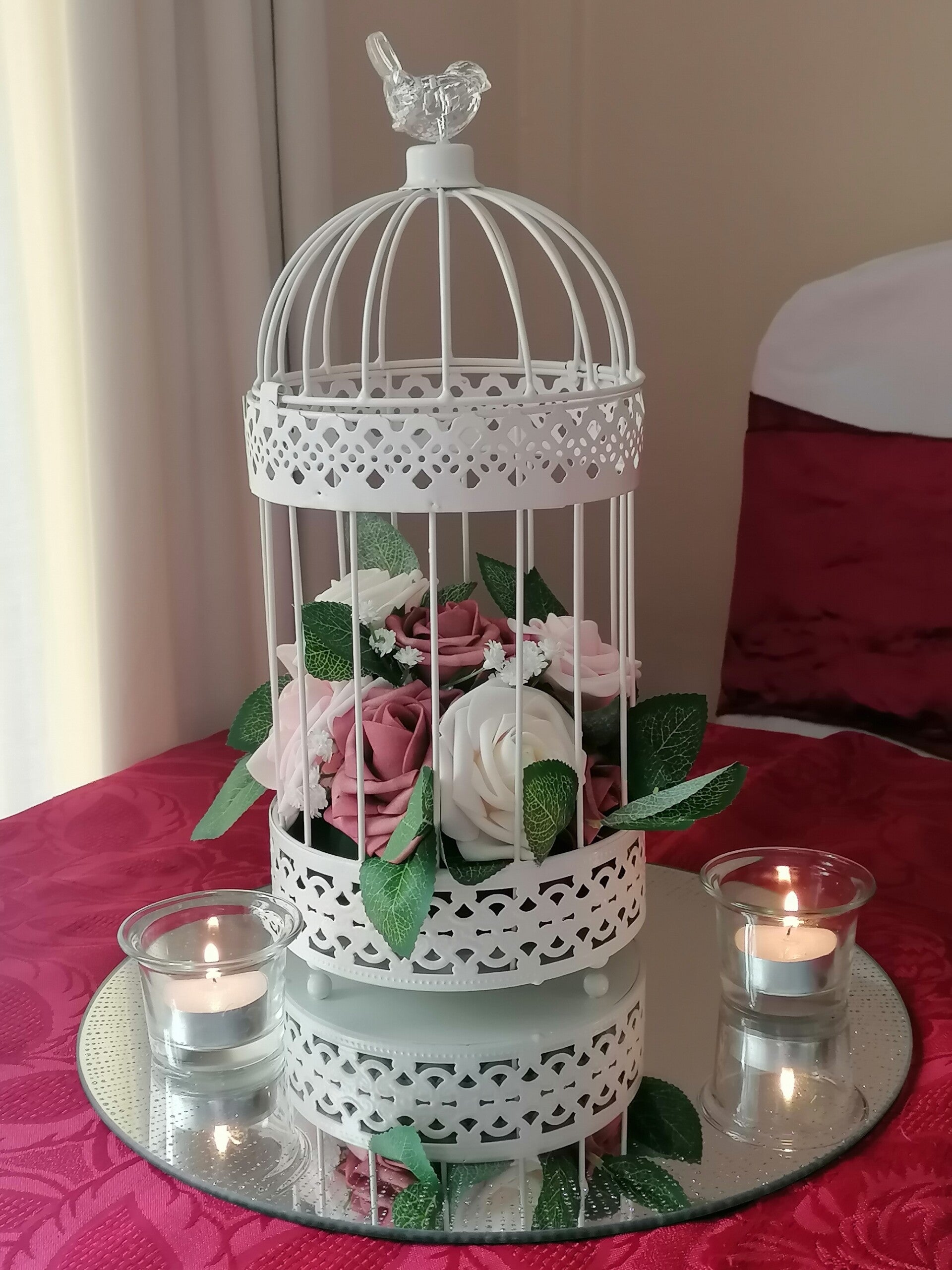 Our small rectangular birdcage floral can be added with tea light candles, with a mirror plate to complete the centrepiece. These small rectangular birdcages can also be used to hold up to around 75 cards - An original vintage looking card box to complement your theme.